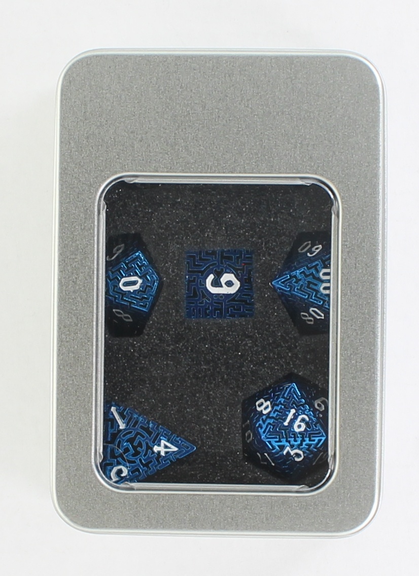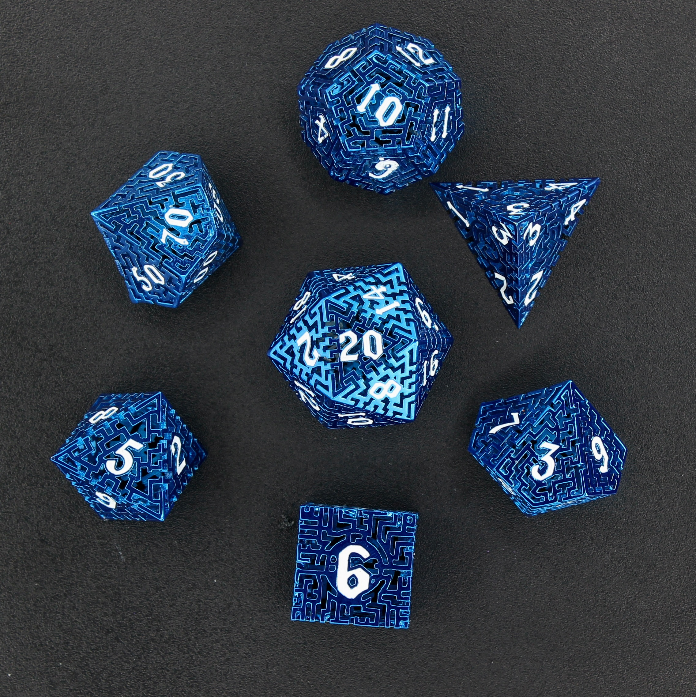 Home/Dice/Hollow Metal Dice and Sets/Blue Hollow Metal Maze Set of 7 Polyhedral Dice