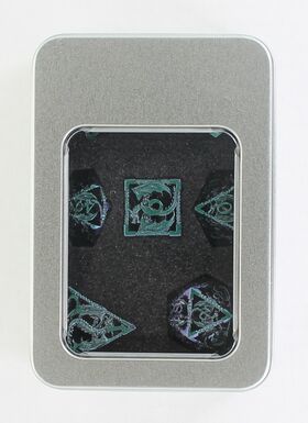 This seven-piece hollow metal dice set is detailed in rainbow tones with a lattice of a dragon on every face. Each number is suspended within the dragons, creating a striking layered design. Perfect for dragon-folk characters or just fans of dragons in general.
