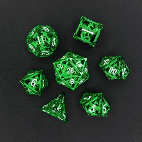 This seven-piece hollow metal dice set is detailed in a metallic green tone with a lattice of a dragon on every face. Each number is suspended within the dragons, creating a striking layered design inked in white for better readability. Perfect for dragon-folk characters or just fans of dragons in general.