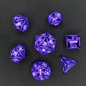 This seven-piece hollow metal dice set is detailed in a metallic purple tone with a lattice of a dragon on every face. Each number is suspended within the dragons, creating a striking layered design inked in white for better readability. Perfect for dragon-folk characters or just fans of dragons in general.