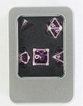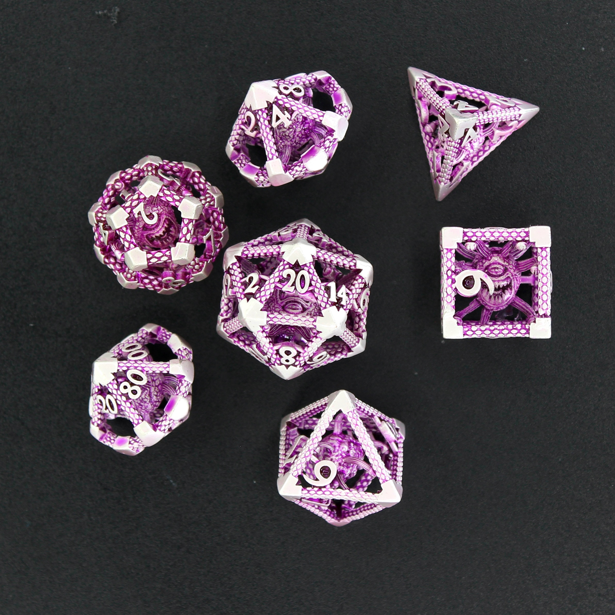 This seven-piece hollow metal dice set features a sinister observing monster suspended within its hollow core, its many eyes peering out through the intricate metal framework. The dice are light pinking in color with a deeper pink in the recesses. The open design gives every roll a haunting depth and may give your character the sense they are being... watched.
