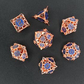 This seven-piece hollow metal dice set is detailed in a metallic silver tone with an intricate lattice of arrow patterns. Each number is suspended within the lattice with a red inked surrounding each number for striking contrast and readability. With the combination of copper color and clockwork-like design this dice would heavily compliment a artificer-type class.