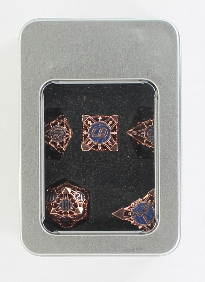 This seven-piece hollow metal dice set is detailed in a metallic silver tone with an intricate lattice of arrow patterns. Each number is suspended within the lattice with a red inked surrounding each number for striking contrast and readability. With the combination of copper color and clockwork-like design this dice would heavily compliment a artificer-type class.