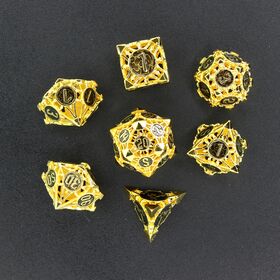 This seven-piece hollow metal dice set is detailed in a metallic gold tone with an intricate lattice of arrow patterns. Each number is suspended within the lattice with a unique design surrounding each number. With the combination of gold color and clockwork-like design this dice would heavily compliment a paladin type class or perhaps a artificer-type class.