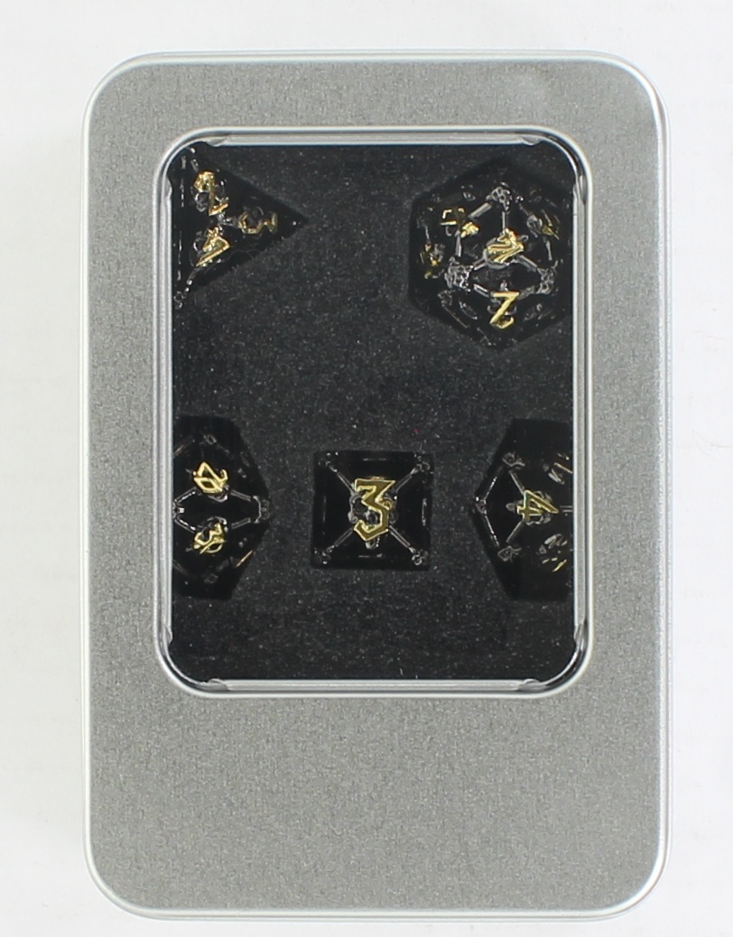 Bring a touch of grim majesty to your tabletop with this Hollow Metal Skull Dice Set. Cast in metallic black its frame formed from interlocking bars joined by grinning skulls at every point with a lattice of smaller skulls supporting each number. The numbers themselves are inked in rich gold, ensuring every roll stands out clearly against the dark metal. Perfect for necromancers or those who like the macabre style.
