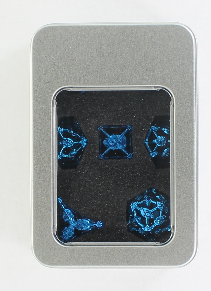 Bring a touch of grim majesty to your tabletop with this Hollow Metal Skull Dice Set. Cast in metallic blue, its frame formed from interlocking bars joined by grinning skulls at every point with a lattice of smaller skulls supporting each number. Perfect for necromancers or those who like the macabre style.
