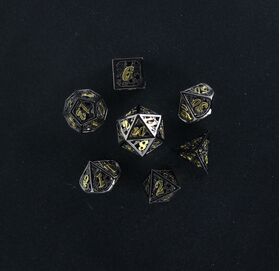 This seven-piece hollow metal dice set combines intricate craftsmanship with bold industrial style. Each die features a latticework design of glossy Black-colored cogs, gears, and mechanical details, creating a striking steampunk aesthetic that’s both rugged and refined. Each number on the dice is painted with gold-colored paint to ensure nice readability in every roll. Perfect for engineers, artificers, or any player with a flair for invention.
