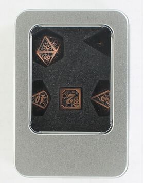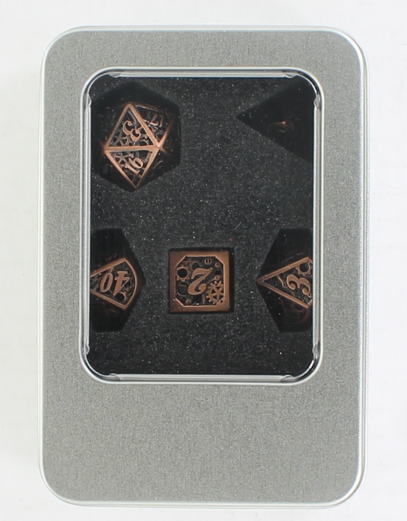 This seven-piece hollow metal dice set combines intricate craftsmanship with bold industrial style. Each die features a latticework design of copper-colored cogs, gears, and mechanical details, creating a striking steampunk aesthetic that’s both rugged and refined. Perfect for engineers, artificers, or any player with a flair for invention.