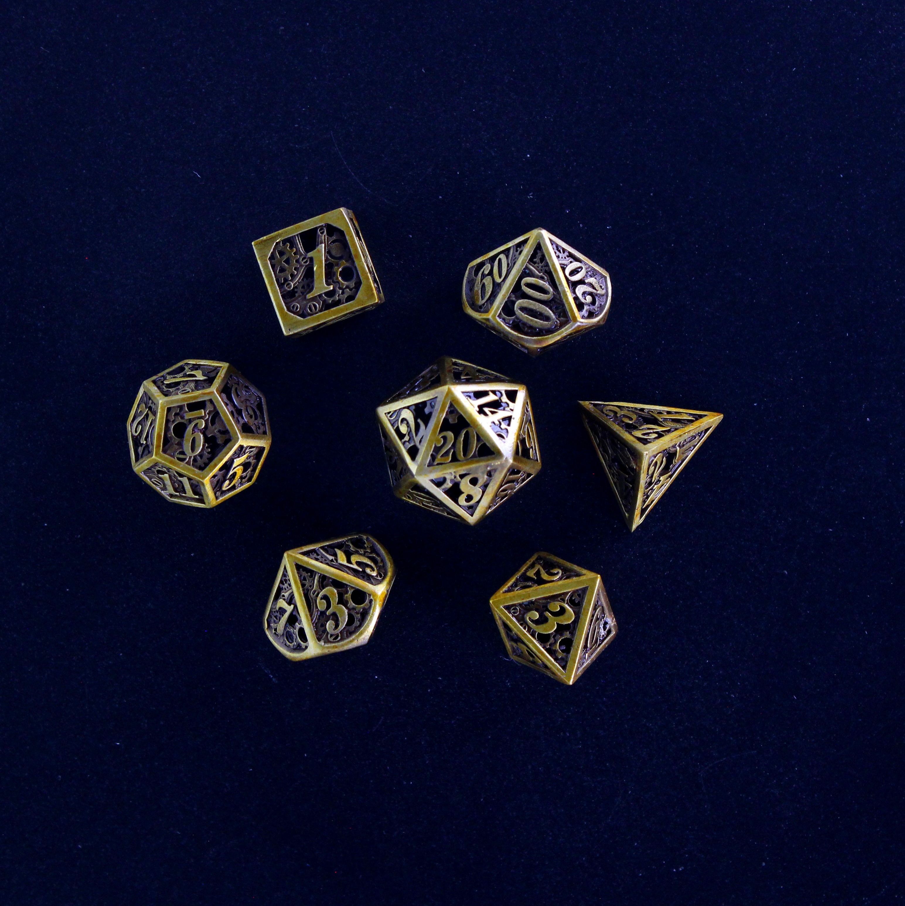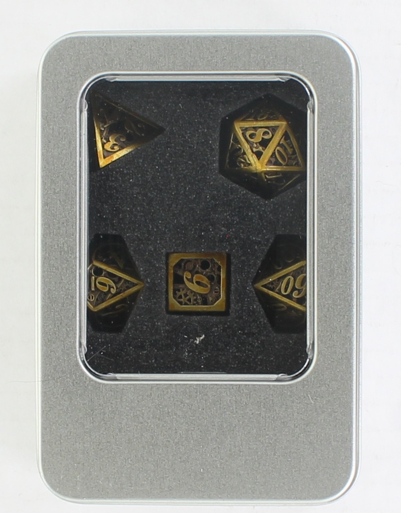 This seven-piece hollow metal dice set combines intricate craftsmanship with bold industrial style. Each die features a latticework design of gold-colored cogs, gears, and mechanical details, creating a striking steampunk aesthetic that’s both rugged and refined. Perfect for engineers, artificers, or any player with a flair for invention.