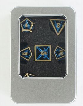 This seven-piece hollow metal dice set is detailed in bronze-colored tones with a bold blue painted lattice of crossed swords on every face. Each number is suspended within the blades, creating a striking layered design. Perfect for fighters, paladins, or anyone who lives by the blade.