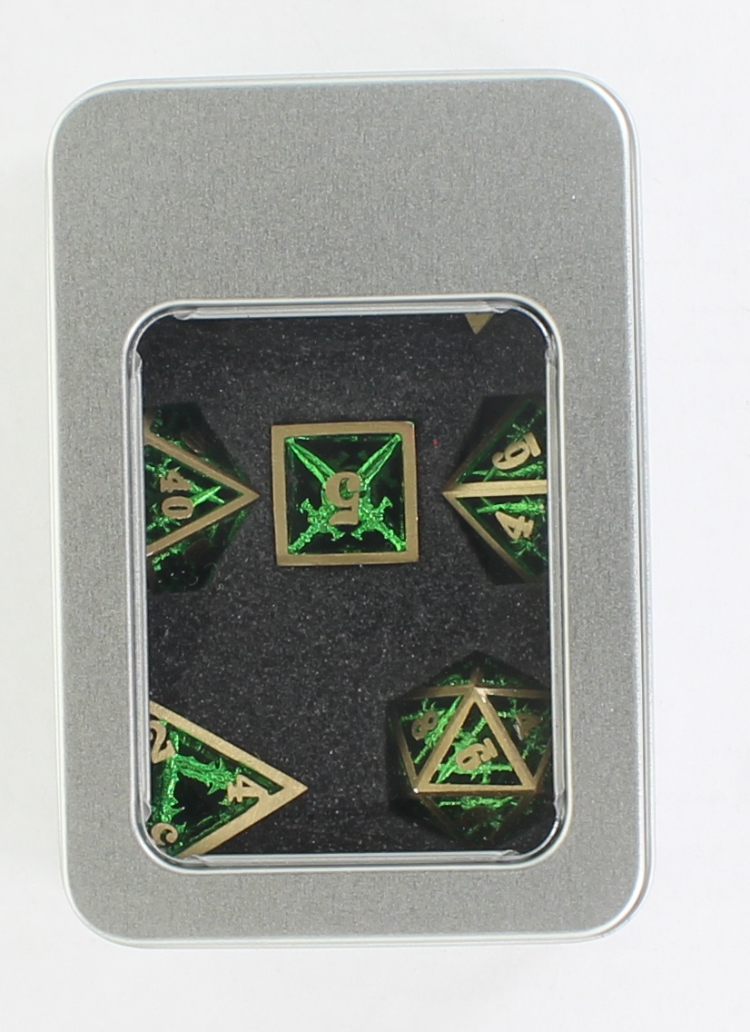 This seven-piece hollow metal dice set is detailed in bronze-colored tones with a vibrant green painted lattice of crossed swords on every face. Each number is suspended within the blades, creating a striking layered design. Perfect for fighters, paladins, or anyone who lives by the blade.