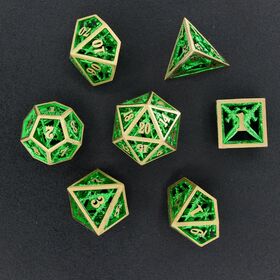 This seven-piece hollow metal dice set is detailed in bronze-colored tones with a vibrant green painted lattice of crossed swords on every face. Each number is suspended within the blades, creating a striking layered design. Perfect for fighters, paladins, or anyone who lives by the blade.
