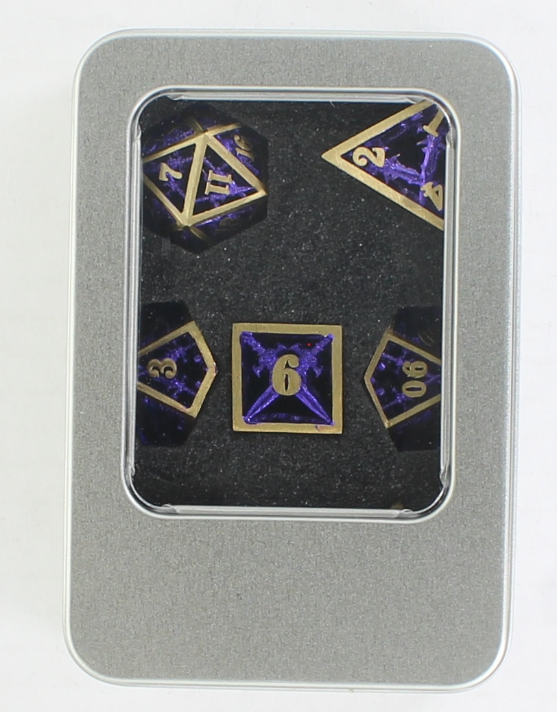 This seven-piece hollow metal dice set is detailed in Bronze-colored tones with a Vibrant Purple painted lattice of crossed swords on every face. Each number is suspended within the blades, creating a striking layered design. Perfect for fighters, paladins, or anyone who lives by the blade.