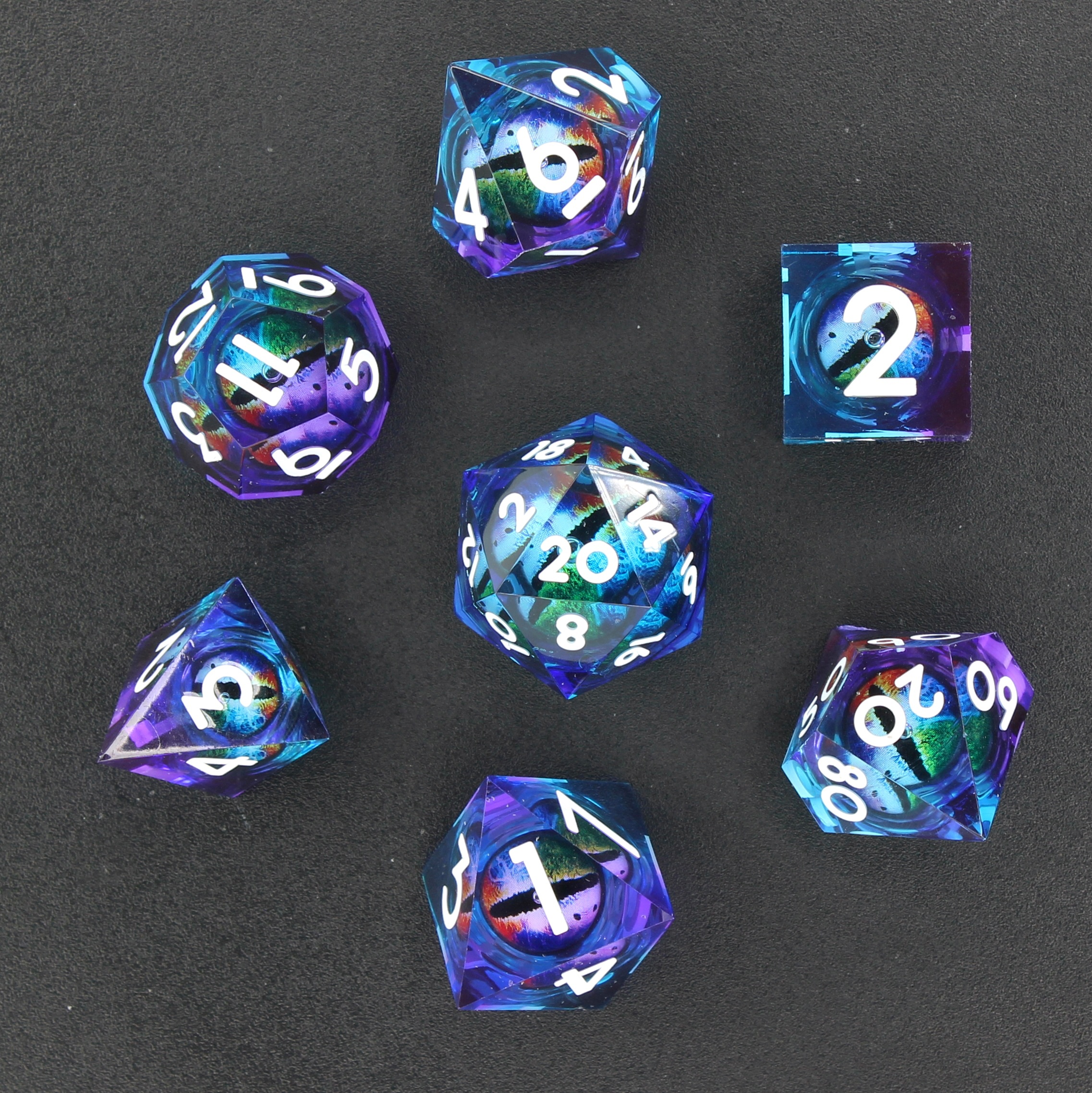 This set of polyhedral dice is cast in transparent blue and purple resin, with every number inked in white. Inside each die is a liquid core that suspends a rainbow dragon’s eye, which reacts to gravity and always looks upward. The dragon watches over every roll!