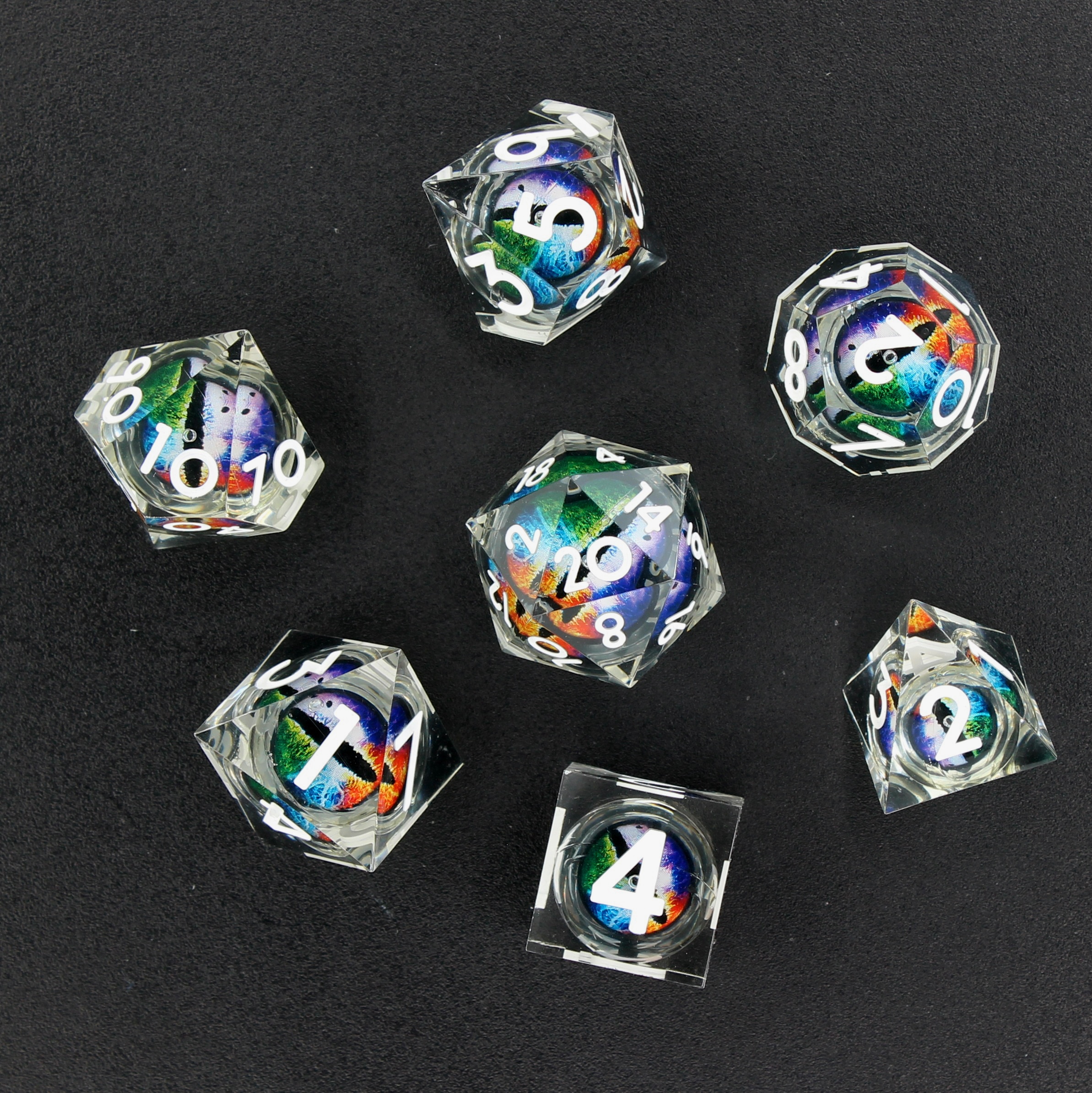This set of polyhedral dice is cast in transparent clear resin, with every number inked in yellow. Inside each die is a liquid core that suspends a rainbow dragon’s eye, which reacts to gravity and always looks upward. The dragon watches over every roll!
