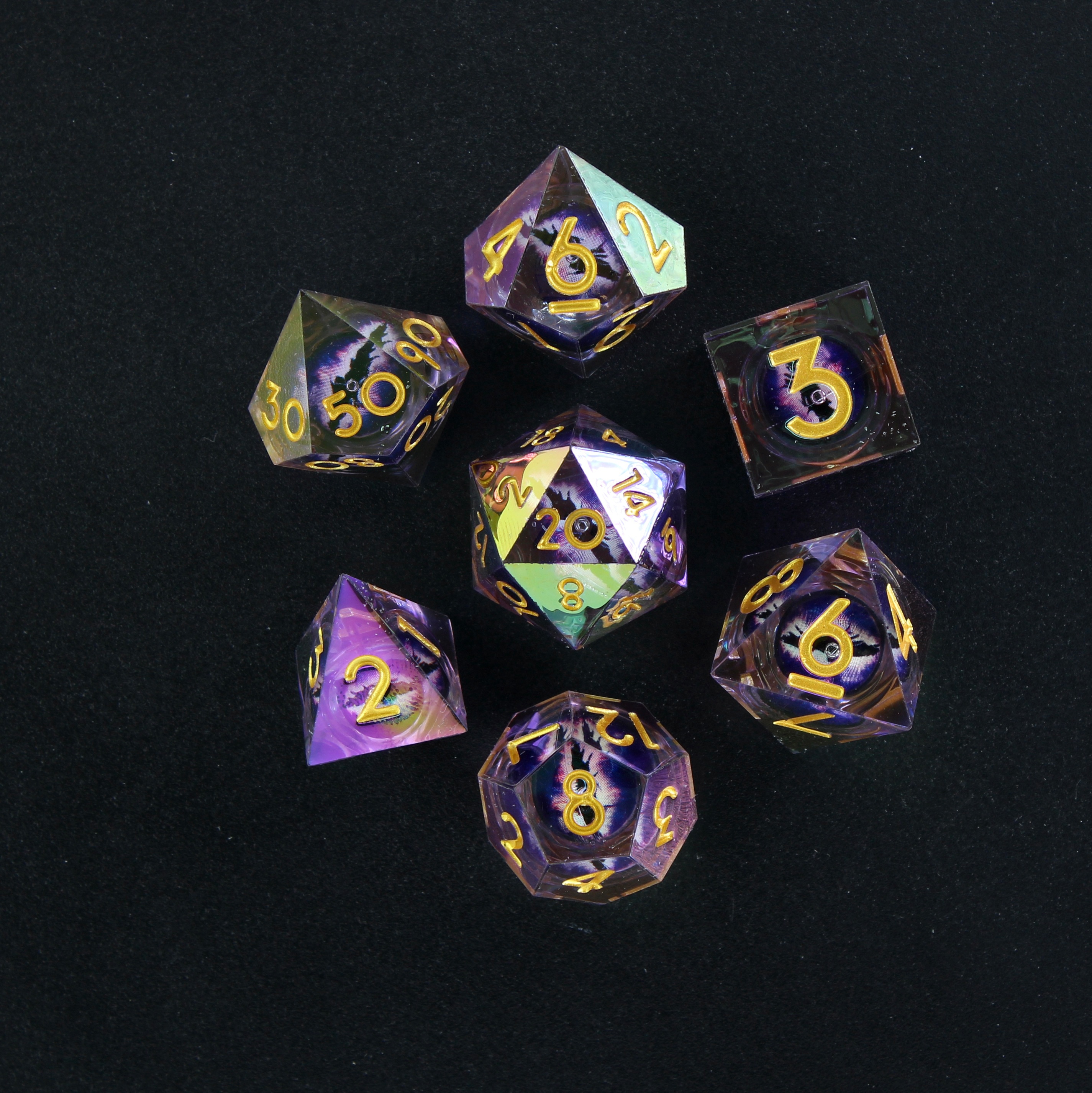 This set of polyhedral dice is cast in transparent resin with a pearlescent shine, with every number inked in gold. Inside each die is a liquid core that suspends a dragon’s eye, which reacts to gravity and always looks upward. The dragon watches over every roll!