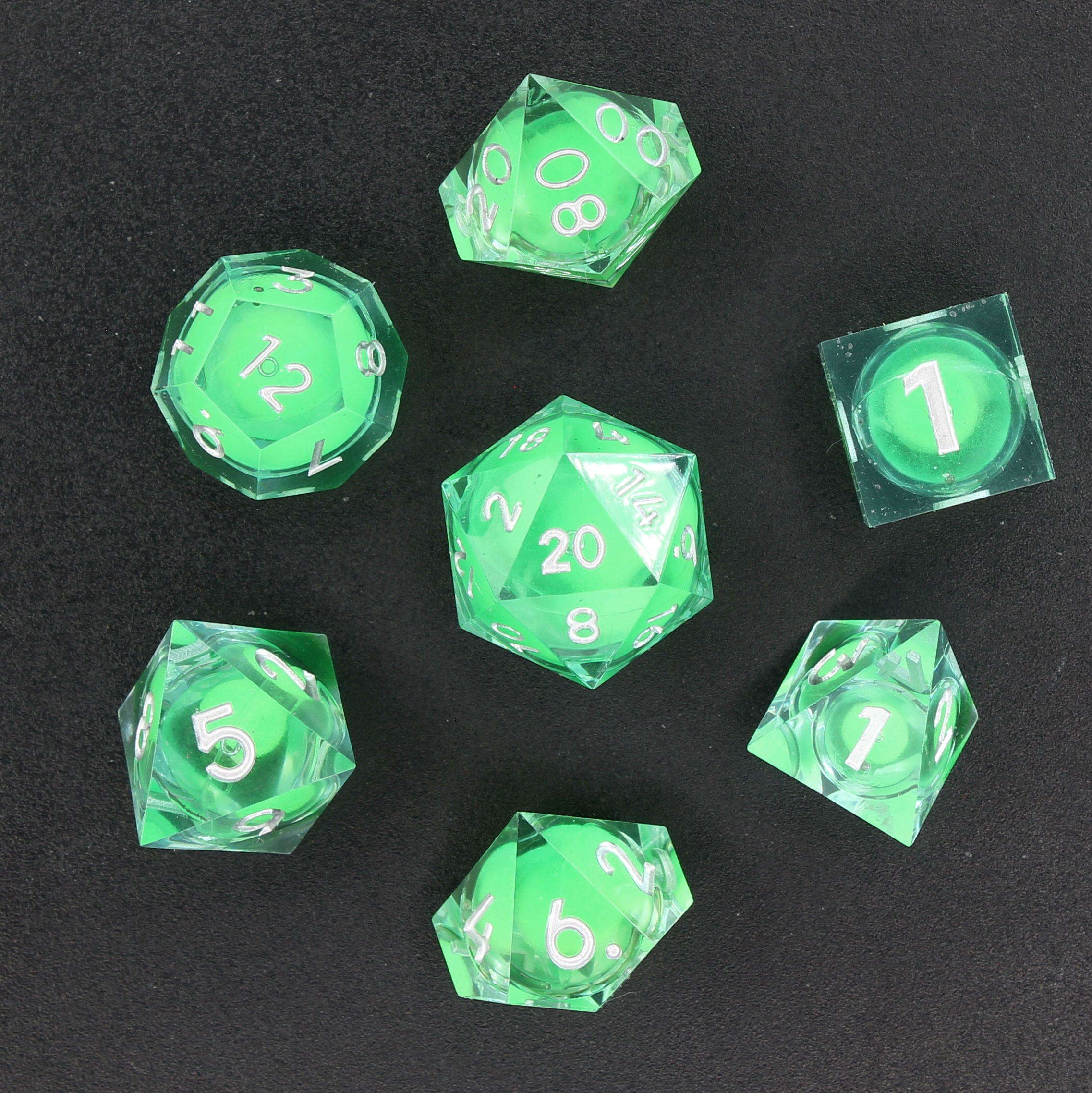 This seven-piece polyhedral dice set features transparent green resin with a liquid core that swirls with sparkling glitter as you roll. Each die catches the light beautifully, creating a dynamic shimmer that brings a touch of magic to every game. Includes D4, D6, D8, D10, D%, D12, and D20.