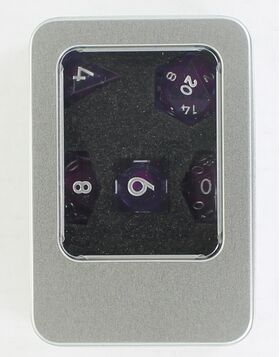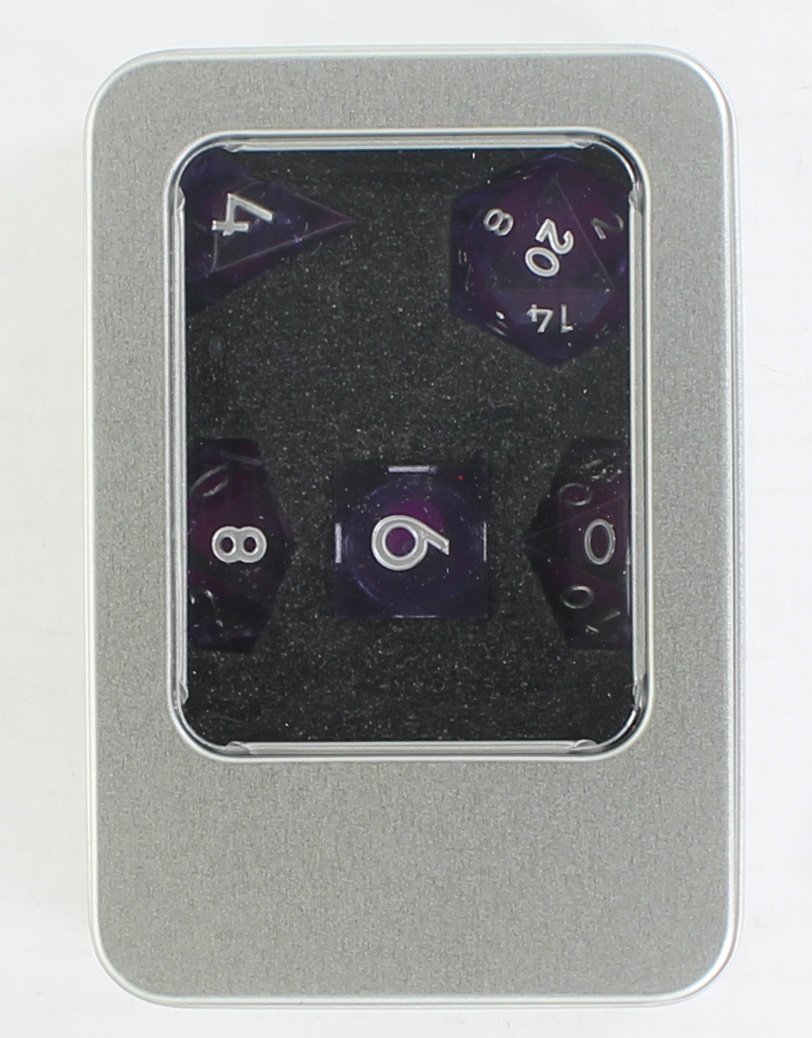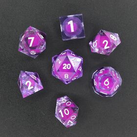 This seven-piece polyhedral dice set features transparent purple resin with a liquid core that swirls with sparkling glitter as you roll. Each die catches the light beautifully, creating a dynamic shimmer that brings a touch of magic to every game. Includes D4, D6, D8, D10, D%, D12, and D20.