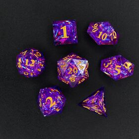 This set of polyhedral dice are cast in transparent purple resin, inked with gold color on every number. Suspended inside every die are tiny strips of pearlescent-like ribbon causing every roll to shimmer.