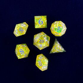 This set of polyhedral dice are cast in transparent yellow resin, inked with silver on every number. Suspended inside every die are tiny strips of pearlescent-like ribbon causing every roll to shimmer.