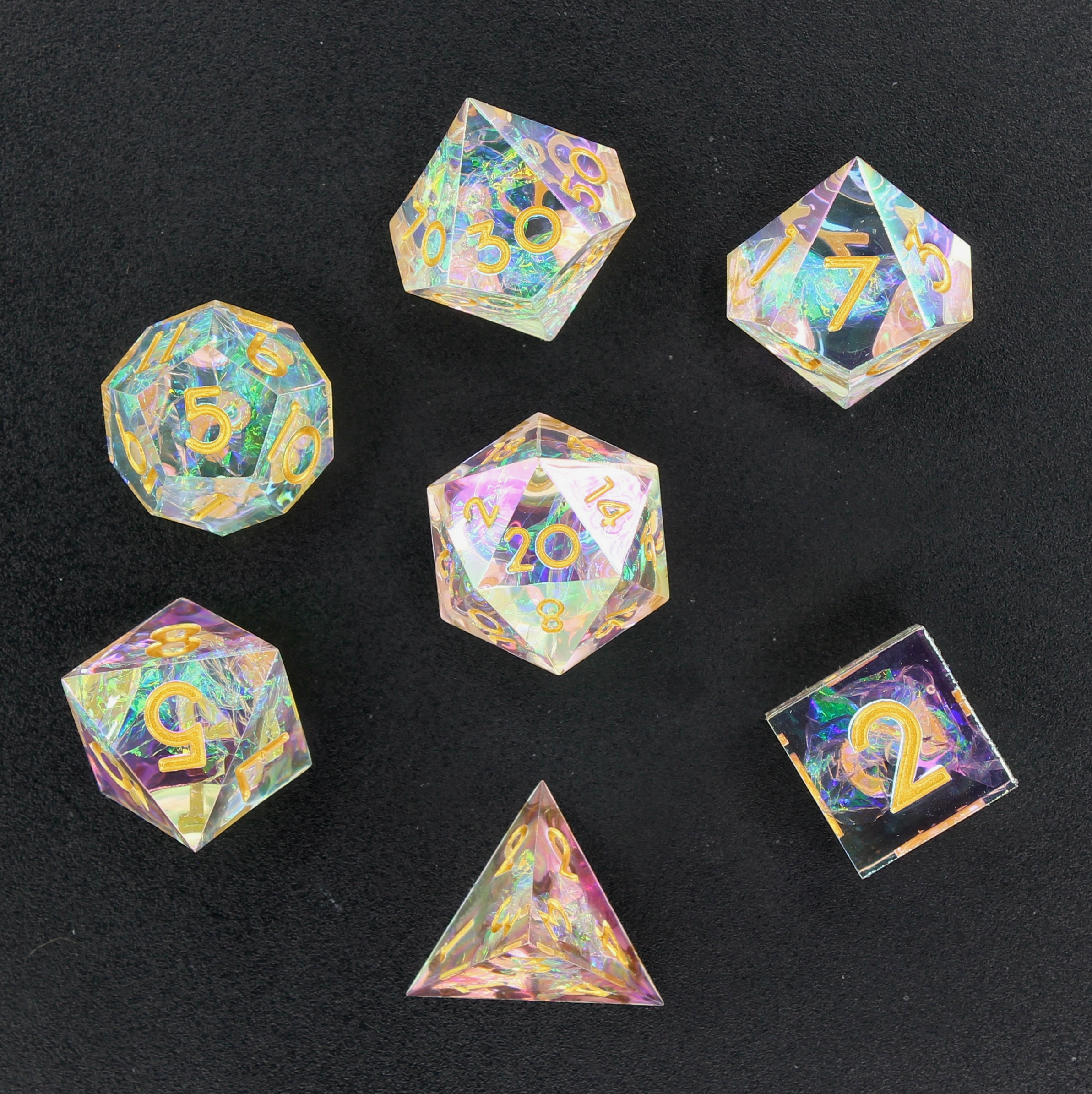 This set of polyhedral dice are cast in transparent clear resin, inked with gold color on every number. Suspended inside every die are tiny strips of pink pearlescent-like ribbon causing every roll to shimmer.