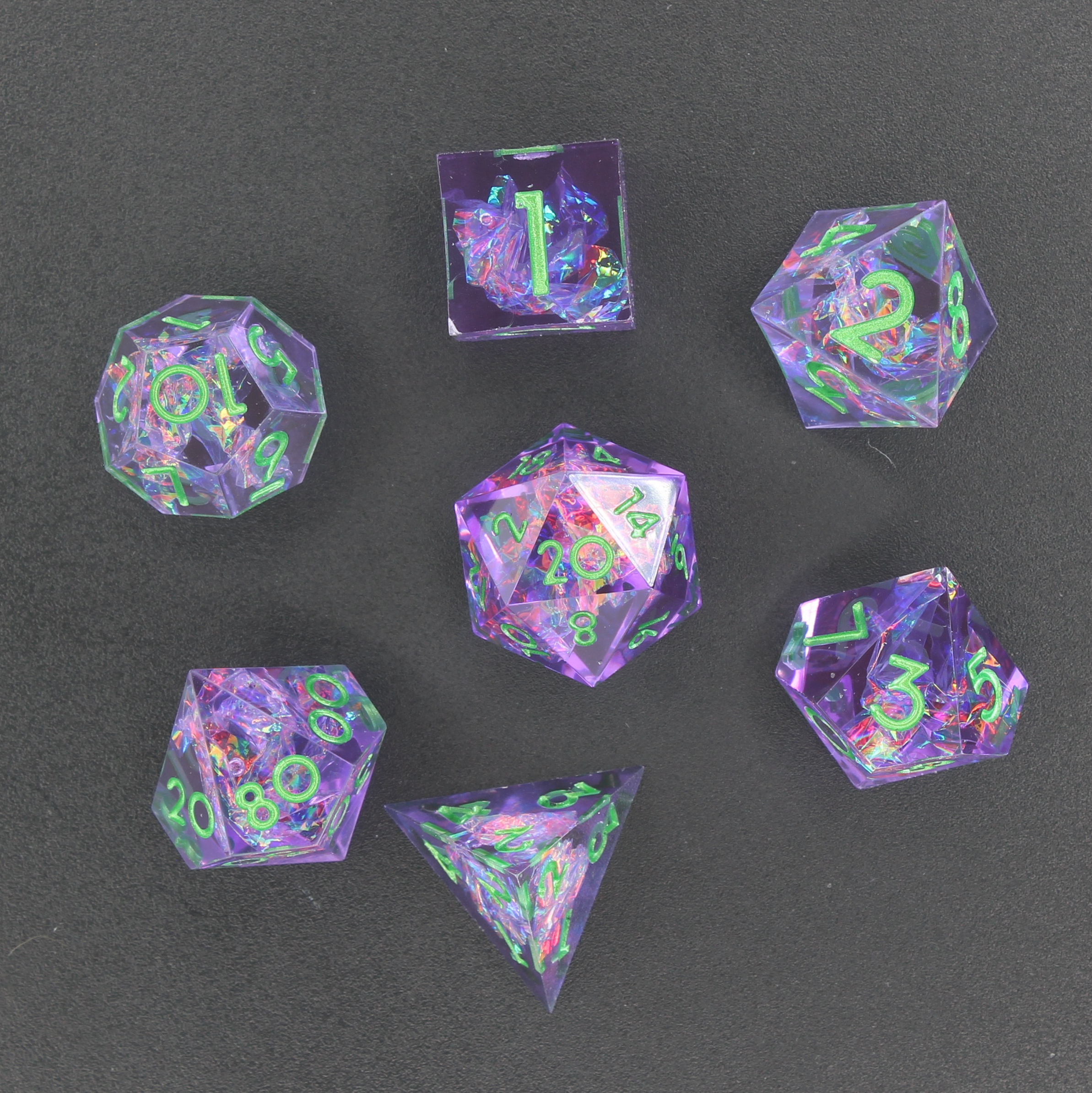 This set of polyhedral dice are cast in transparent purple resin, inked with green on every number for striking contrast. Suspended inside every die are tiny strips of pearlescent-like ribbon causing every roll to shimmer.