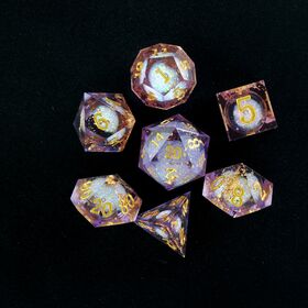 This set of polyhedral dice is cast in transparent pink and purple resin, with each number inked in gold. Inside each die are gold flecks and a liquid core that suspends glitter, ensuring every roll sparkles.