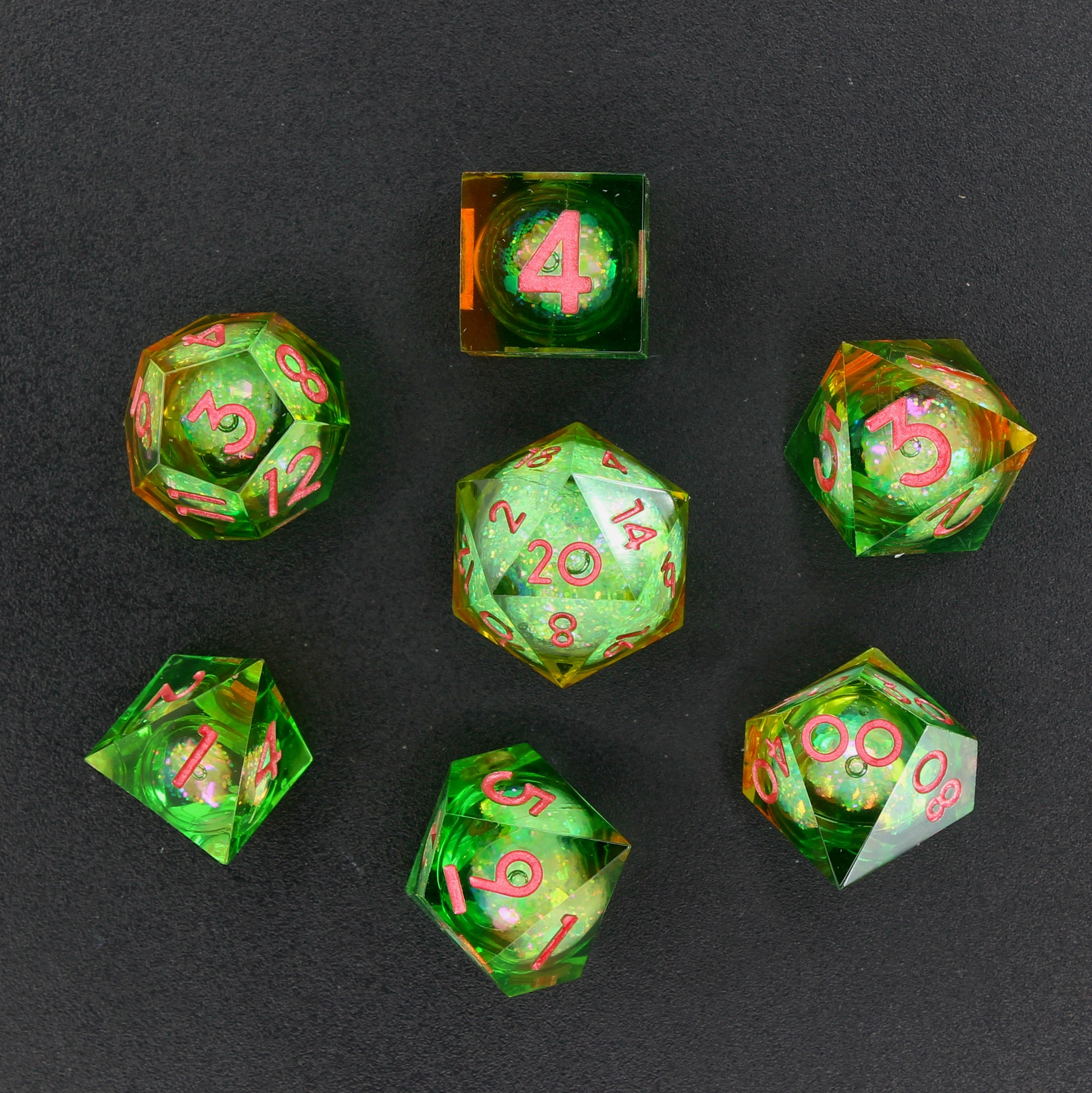 This set of polyhedral dice is cast in transparent green and orange resin, with every number inked in orange. Inside each die is a liquid core that suspends glitter, ensuring every roll sparkles.