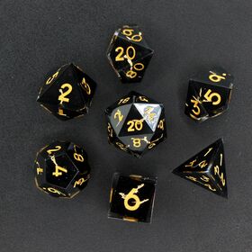 This set of polyhedral resin dice are cast in black and clear resin with striking gold flecks stylized to mimic gold cracks. Each number is inked with gold color for contrast.