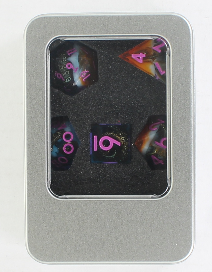 Plunge into the unknown with the tenticles dice set. A mesmerizing collection of seven polyhedral dice crafted from premium resin. A translucent deep blue swirled with opaque white and orange currents. The numbers are inked with a stunning pink color. Suspended within the resin are intricate kraken tentacles.
