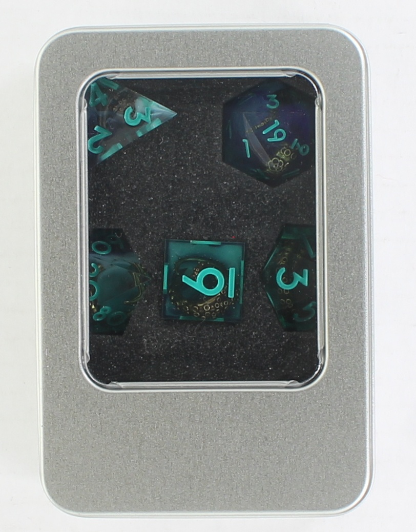 Plunge into the unknown with the tenticles dice set. A mesmerizing collection of seven polyhedral dice crafted from premium resin. A translucent shallow and deep blues swirled lightly with opaque white to mimic rough waters. The numbers are inked with a light blue color. Suspended within the resin are intricate kraken tentacles.