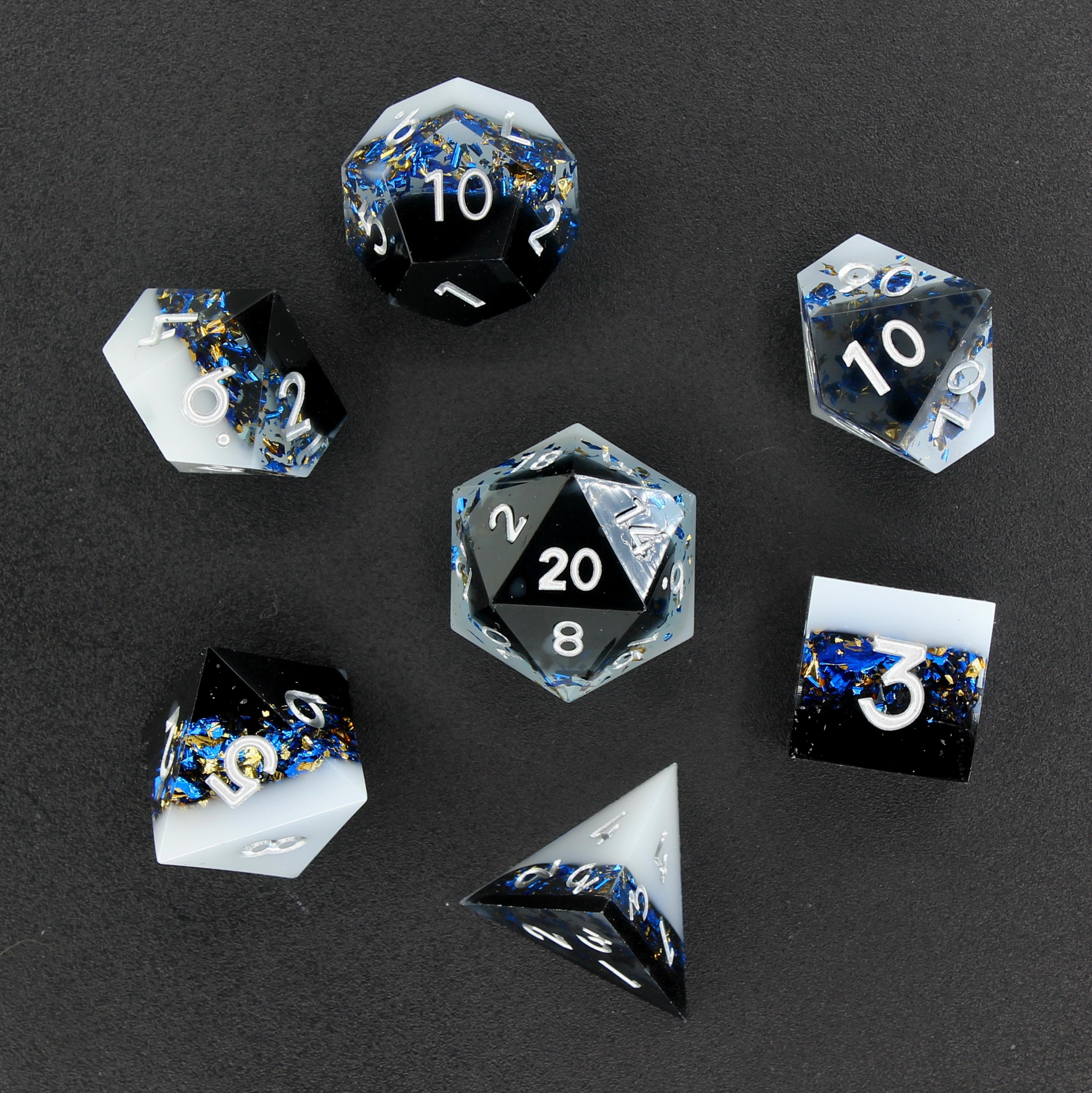 Each die features a striking contrast of opaque white and deep black, separated by a crystal-clear acrylic layer that reveals shimmering blue and gold glitter foil suspended within. The result is a shimmer that shines with every roll.