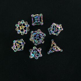 Bring a touch of grim majesty to your tabletop with this Hollow Metal Skull Dice Set. Cast in rainbow metallics, its frame formed from interlocking bars joined by grinning skulls at every point, with a lattice of smaller skulls supporting each number. Perfect for necromancers or those who like the macabre style.