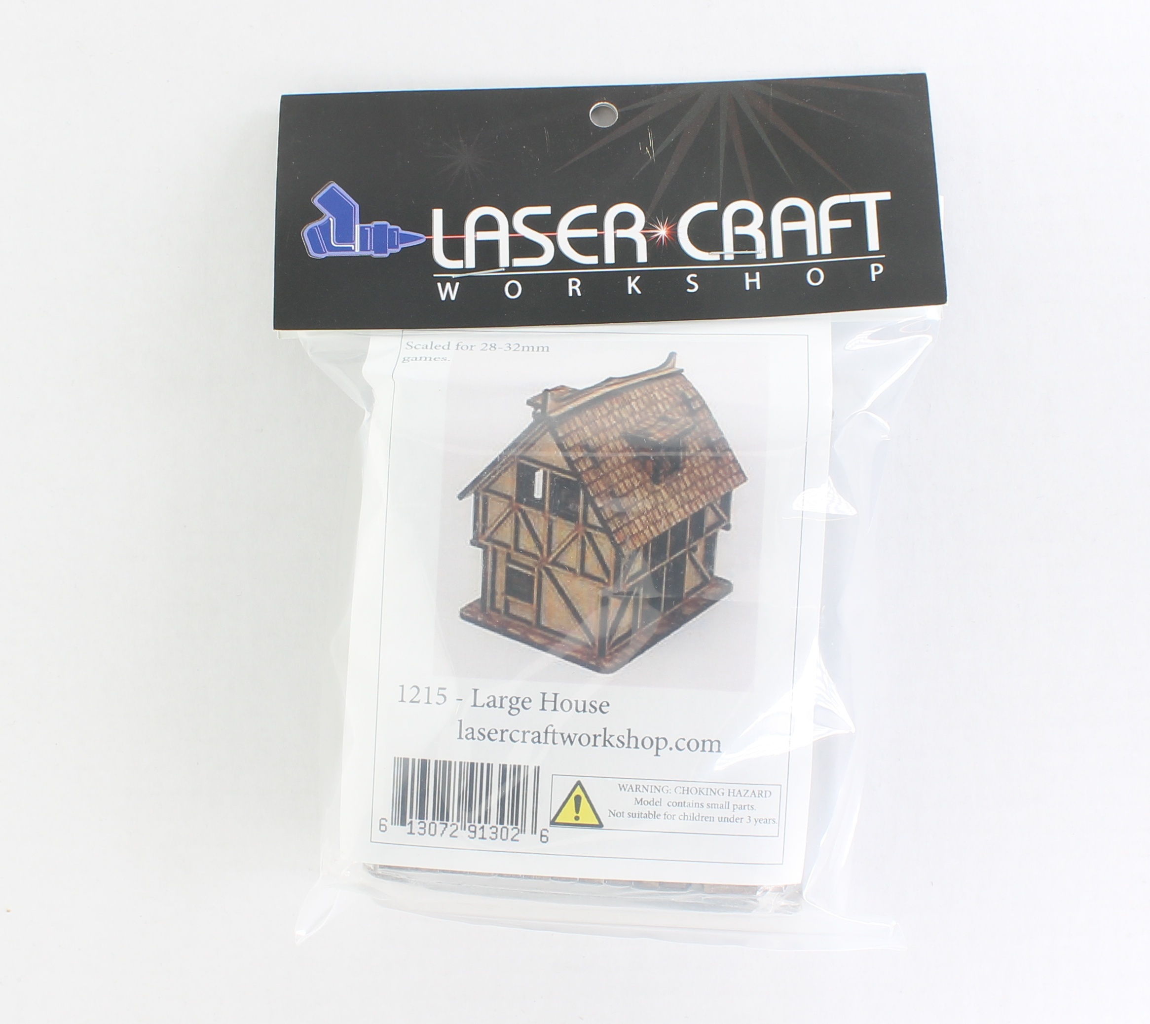 Our half timbered Large House shows off dual dormers and extruding supports for the second story. The roof is removable to allow the whole model to be used for your games. Designed for 28mm miniatures. Made of sturdy 3mm MDF board. Kits ship unassembled and unpainted.