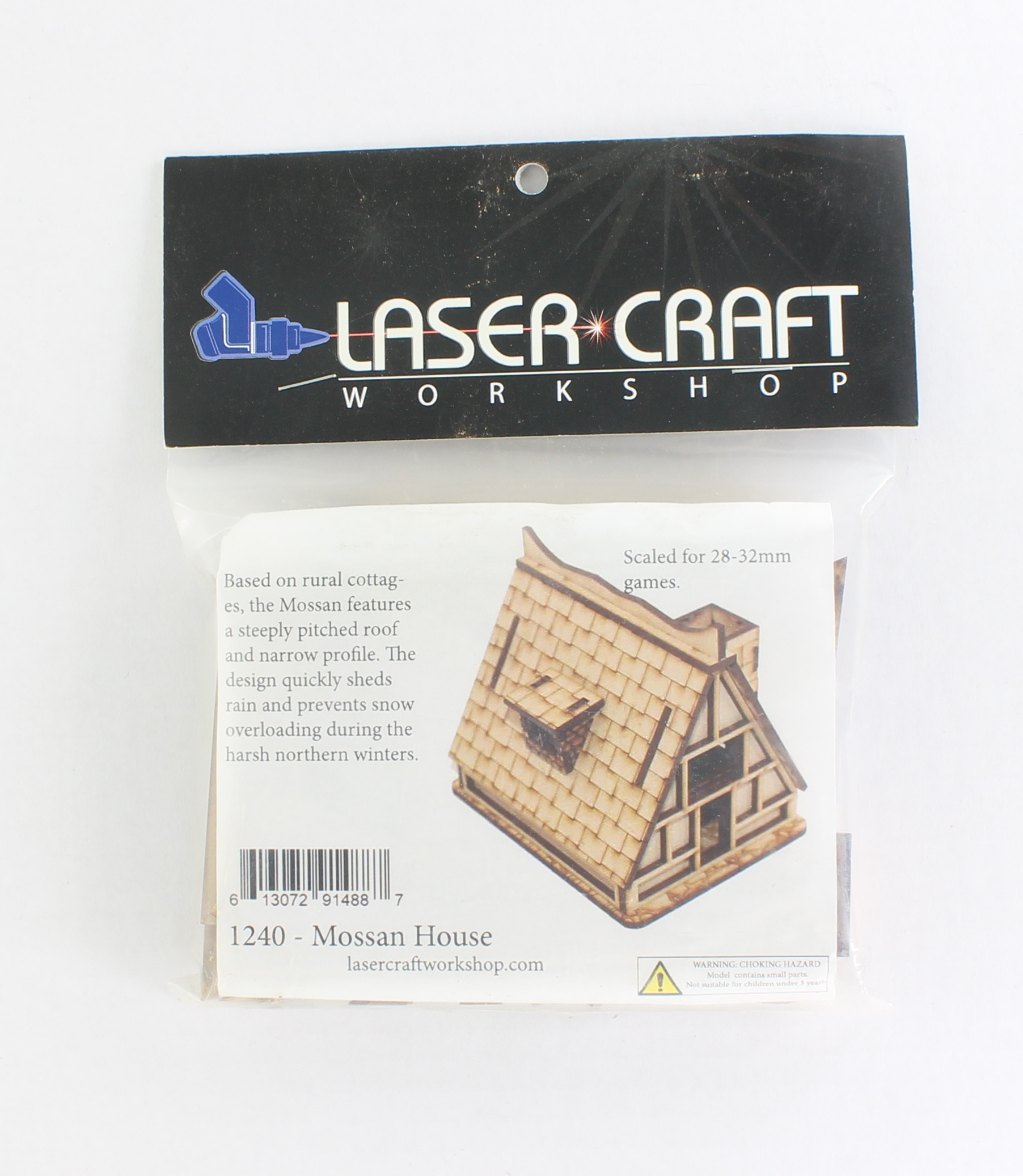 Constructed of sturdy, laser cut 3mm MDF board, our Mossan style home features a removable roof and playable interior with single floor. The model is built on a 4 ½ inch by 3 ½ inch base and stands approximately 4 inches tall.