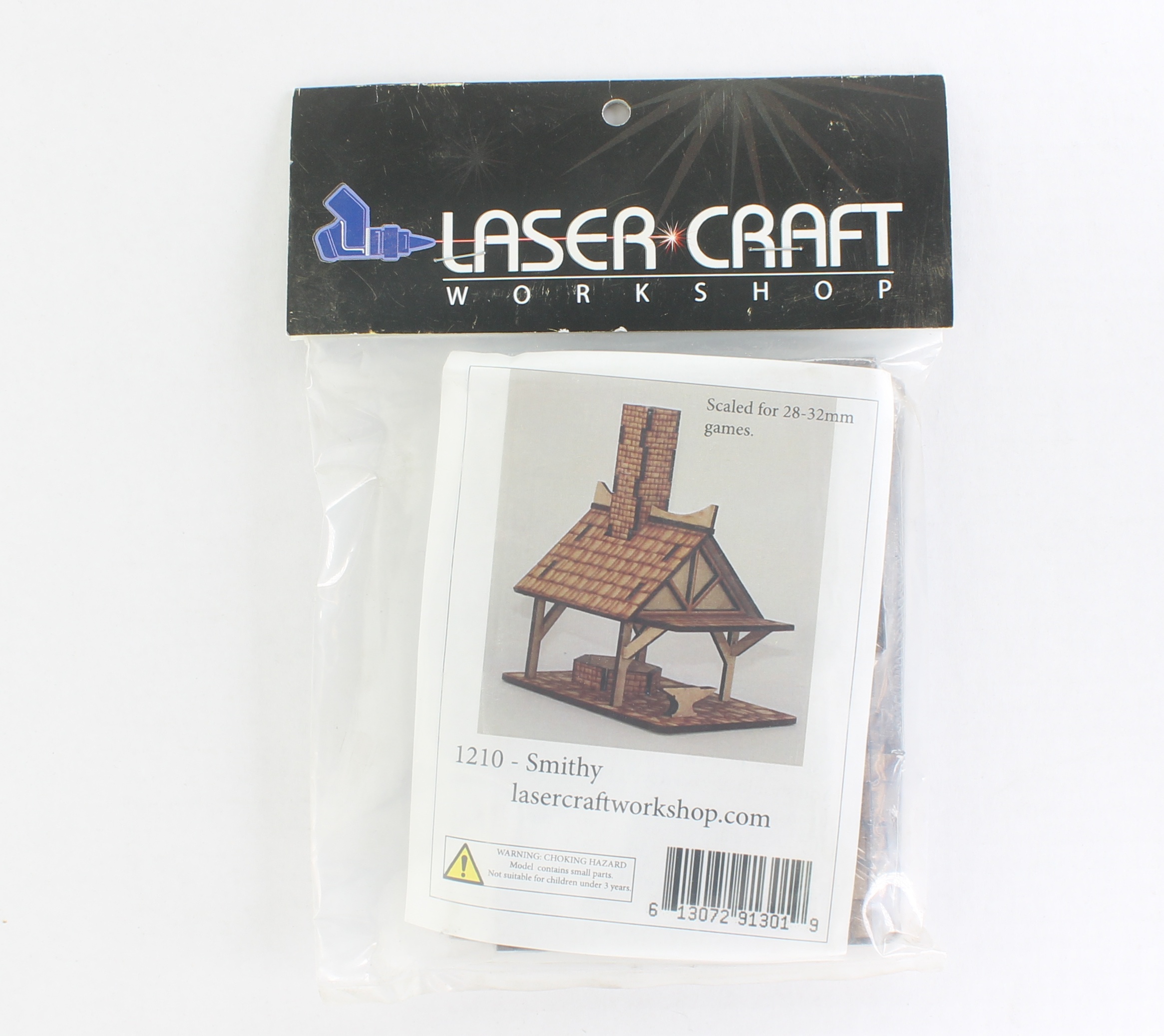 Our Smithy is a half timbered open sided work space with interior detailing of the fume hood, fire pit and anvil under the overhang. Designed for 28mm miniatures. Made of sturdy 3mm MDF board. Kits ship unassembled and unpainted.